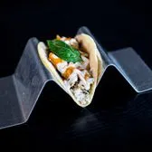 Roasted Tikka Chicken, rotisserie chicken, spicy tikka sauce, buttered cilantro basmati rice, raita crema, Thai basil, corn tortilla | 380 cal. Ingredients are gluten free. However, the ingredients are cooked in the same area as items that may contain gluten.