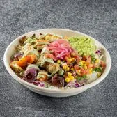 Seasonal Veggie Bowl (V) (GF), roasted veggies, guac, corn pico, avocado crema, pickled onion, queso blanco, napa slaw, basmati rice