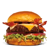 Includes burger patty, bacon, American cheese, swiss cheese, shredded lettuce, pickles, red onion, tomato, burger sauce, brioche bun.