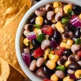 Black-eyed peas, black beans, corn, pico de gallo, bell peppers, tortilla chips.