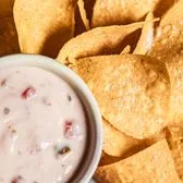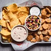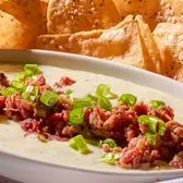 Scratch-made green chile queso, chopped brisket, chives, tortilla chips.