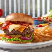 Angus beef patty, American, cheddar and pepper jack cheese, bacon, lettuce, tomato, red onion, pickles, Texas spread, potato bun.