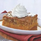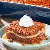 Pumpkin spice cake, candied pecans, caramel sauce, whipped cream.