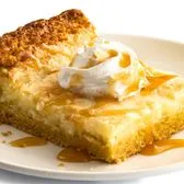 Butter cake with a cheesecake layer, whipped cream, caramel sauce.