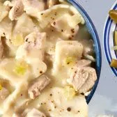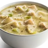 Hand-rolled dumplins, roasted chicken, celery, onions, chicken broth.