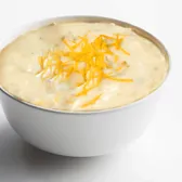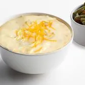 Creamy potato soup, diced potatoes, bacon, green onions, shredded cheese.