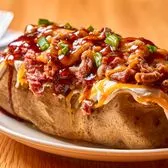 Giant loaded baked potato, chopped brisket, butter, sour cream, shredded cheese, chives, BBQ drizzle.