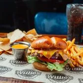 A quarter pound patty on a potato bun, topped with lettuce, tomato, onion, and burger sauce, and choice of cheese! Served with a personal chips and queso, choice of side, and choice of drink.