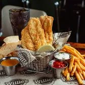 Two massive catfish filets, served with cocktail and tartar sauce. Served with a personal chips and queso, choice of side, and choice of drink.