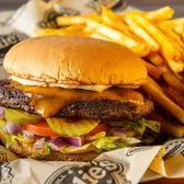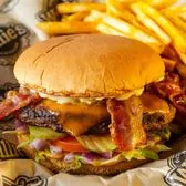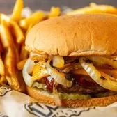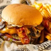 Half pound beef patty, cooked medium well, cheddar cheese, grilled onions, pickles, and BBQ sauce. Choice of one side.