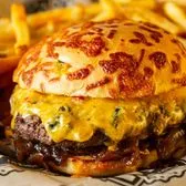 Half pound burger with caramelized onions and roasted pepper cheese mix on a jalapeno cheddar bun. Choice of one side.