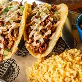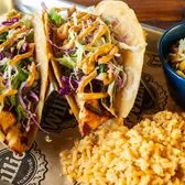 Two shaved chipotle ribeye tacos, topped with onion & cilantro, spicy crema, and cotija cheese. Served with choice of two sides.