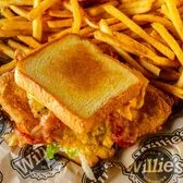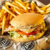 Fried chicken breast with jalapeno mayo, bacon, lettuce, tomato, and roasted pepper cheese mix on Texas toast. Choice of one side.