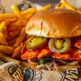 Two sauced tenders, jalapenos, cabbage slaw, served on a brioche bun with choice of one side.