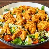 Spring mix, iceberg, & romaine lettuce topped with fried chicken, bacon, street corn, diced egg, cherry tomatoes, blue cheese crumbles, served with Ranch and a creamy chipotle sauce