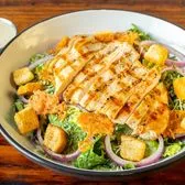 Sliced grilled chicken, romaine lettuce, shredded parmesan, grilled red onions, parmesan crisps, and croutons. Served with Caesar dressing.
