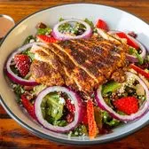 Blackened chicken, spring mix, strawberries, candied pecans, red onions, feta cheese, and dried cranberries. Served with strawberry-balsamic vinaigrette.