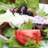 Mixed field greens, romaine salad, fresh feta, Kalamata olives, cherry tomatoes, cucumbers, red onion.