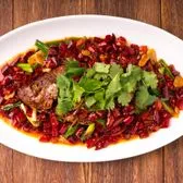 Chef’s award-winning pot-roasted whole live tilapia with garlic, ginger, scallions in Sichuan mala sauce, and covered in red chilies and whole Sichuan peppercorns, garnished with cilantro.