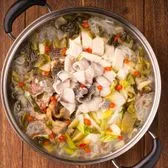 Sliced live tilapia, cooked in a savory sour soup of house-made sauerkraut and pickled gingers, napa cabbage, tofu, and sweet potato vermicelli.