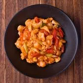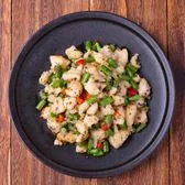 Basa fish cubes stir-fried with green onion, scrambled egg, and tomato in tomato sauce