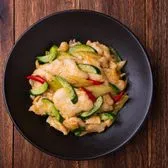 Basa fish fillet sautéed with pickled peppers, cucumber, and ginger in white sauce and red chili oil