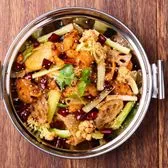 Battered and deep-fried basa fish fillet heavily seasoned with ginger, garlic, dry red chilies, Sichuan peppercorns, hot pot sauce, fermented black bean, aged hot pot oil, along with potato, cauliflower, celery, lotus roots, and king oyster mushroom