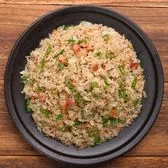 Fried rice of shrimp, beef, chicken, eggs, and green and white onions.