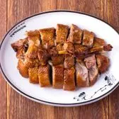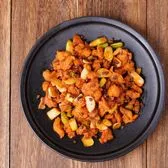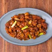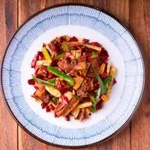 Bone-in and skin on chicken quarter chopped and sautéed with jalapeño in fermented broad bean paste and sweet flour sauce
