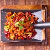 Bite size crispy dark meat chicken flash fried with dry red chilies, whole Sichuan peppercorns in mala seasoning and fermented broad bean paste, garnished with sesame seeds and cilantro