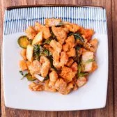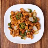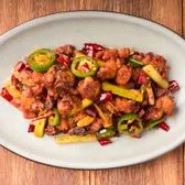 Battered and deep-fried dark meat chicken sautéed with onions, jalapeño peppers, basil, and drops of red pepper powder