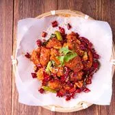Battered and deep-fried dark meat chicken sautéed with peppercorn oil and whole baked red Sichuan peppercorns. These peppercorns are to be eaten with the chicken pieces