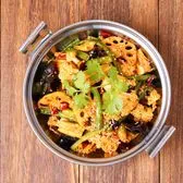 Potato, cauliflower, lotus root, king oyster mushroom, wood ear mushroom, string bean, and bean curd sheet, seasoned with ginger, garlic, dry red chilies, whole Sichuan peppercorn, hot pot sauce, fermented black bean, aged hot pot oil