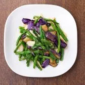 Sautéed Chinese eggplants and string beans with basil in a sweet and salty pasty soy sauce and oyster sauce