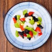 Sautéed mountain yam, ginkgo nuts, wood ear mushroom, Chinese stem lettuce, and red bell peppers in white sauce and a dash of rice vinegar