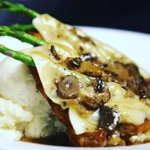 “pan fried” chicken breast, mashed potatoes, asparagus, melted monterey jack, housemade mushroom madeira sauce