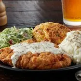 hand-breaded chicken breast, country gravy, two standard sides, scratch cheddar biscuit (gravy is served on the side)