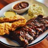 ‘center cut’ baby back ribs (half slab), hand-breaded chicken tenderloins, two standard sides (buttermilk ranch or honey mustard)