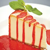 traditional new york style, graham cracker crust, fresh strawberries, strawberry puree