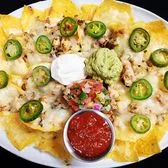 chicken or ground beef, tortilla chips, refried beans, cheddar, housemade cheese sauce, jalapeno, pico de gallo, sour cream, guacamole, salsa