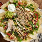 chicken, ground beef or veggie patty, sautéed vegetables, cilantro, cotija, white cheddar, jalapeño, sour cream, pico de gallo, tortilla chips (honey lime vinaigrette or avocado ranch) (salad dressing served on the side)