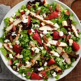 grilled chicken, spring mix + fresh greens, red onion, apple, strawberries, celery, candied pecans, crumbled goat cheese, balsamic vinaigrette (salad dressing served on the side*) PRO-TIP - To achieve a more in-house salad experience, add desired dressing amount, close lid, shake and reopen