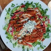 grilled or fried chicken, wing sauce, fresh greens, chopped bacon, white cheddar, pico de gallo, tortilla strips, crumbled bleu, chipotle ranch (salad dressing served on the side*) PRO-TIP - To achieve a more in-house salad experience, add desired dressing amount, close lid, shake and reopen