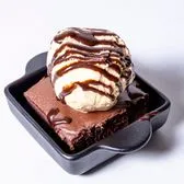 Gluten free brownie topped with creamy vanilla ice cream and chocolate syrup