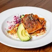 Grilled salmon, avocado, cucumber, radish, jalapenos, cabbage slaw, rice, miso glazed sweet potatoes and miso chili butter