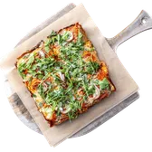 Spicy Italian sausage, banana and sweety drop peppers, roasted garlic, Calabrian purée, and spicy red sauce. Finished with shaved red onion and Pecorino Romano.