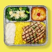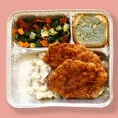 Hearty meals made in-house, frozen in retro-style trays, and ready to pop in the oven when you need them. Hand-dipped buttermilk boneless chicken breasts with housemade country gravy served with red skin mashed potatoes and sautéed baby spinach + bacon, with a blue corn cake dessert [1750 cal]