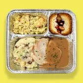 Hearty meals made in-house, frozen in retro-style trays, and ready to pop in the oven when you need them. Roasted turkey breast served with housemade gravy, mashed potatoes, sweet corn and celery + onion stuffing, with a huckleberry-apple cake dessert [1550 cal]
