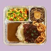 Hearty meals made in-house, frozen in retro-style trays, and ready to pop in the oven when you need them. Meatloaf, brown gravy, red skin mashers, garlic butter corn, peas + carrots, peanut butter cup brownie