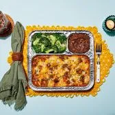 Hearty meals made in-house, frozen in retro-style trays, and ready to pop in the oven when you need them. Housemade meat sauce, ricotta, mozzarella, romano + parmesan cheeses, served with garlic parmesan broccoli + warm cannoli cake